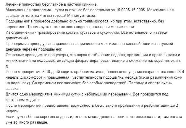 Не менее ужасное предложение сделал другой потенциальный покупатель – Ирины, которая общалась с Еленой по мейлу. Ирина представилась администратором одного из VIP БДСМ клубов. Ирина ищет потенциальных испытуемых для любителей БДСМ именно из среды продавцов органов. Предложение Ирины просто “шикарно” – за 10-15 тыс. долларов США надо выдержать многочасовые пытки на ступнях ног!