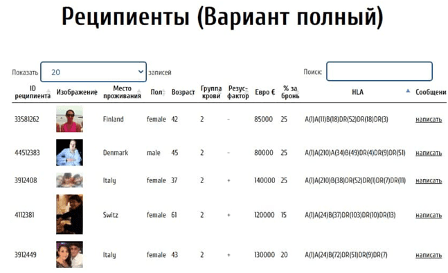 Третий вид мошенничества – сайт “Ринал” (https://ranetaems.com, http://renal.pro). Если зайти на этот сайт то первое впечатление такое – глобальная европейская организация (центральный офис в Германии), которая подыскивает лицу которое хочет продать свою почку, реципиента. Услуга платная – чтобы получить доступ к базе на 14 дней следует выложить 70 евро. Хочешь искать реципиента дольше – добавь еще 70 евро и т.п. Именно интереснее начинается тогда, когда клиент внесет эту сумму. Открывается база в которой сотни реципиентов из Дании, Швеции, Великобритании и других европейских стран. За почку правят огромные средства – от 70 до 110 тыс. евро. Если клиент находит реципиента, последний перечисляет ему аванс (до 20% общей суммы, через нотариальную запись), донор проходит дополнительные анализы и отправляется в страну, где будет проходить операция. Следующую часть денег донор получает перед операцией, а остальные – после операции. Однако при поиске реципиента происходит самое интересное. Чтобы выбрать нужного реципиента, донор должен иметь информацию о совместимости ДНК (HLA). Получить такую информацию предлагают двумя способами – 1) сделать дорогие тесты в лаборатории 2) внести средства снова на сайт и на основе биохимического анализа крови работники сайта сами выведут эти показатели (полная чушь). В интернете удалось найти жертв этого сайта, которые платили деньги, однако так и не нашли реципиентов