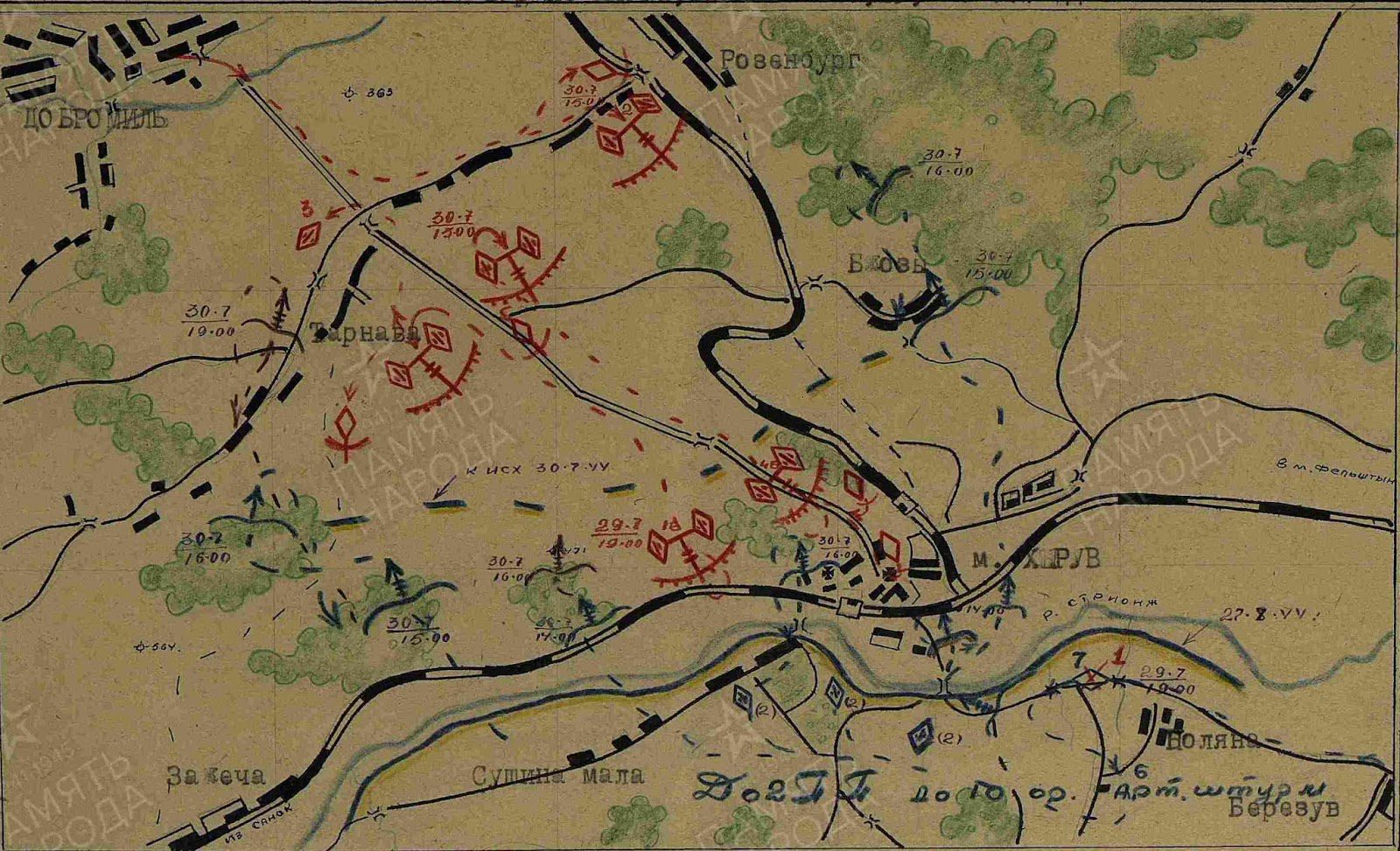 По состоянию на 27 июля 3-й САД вел бои с немецкими войсками в районе Яворова и Мостиск, а 1-й САД находился недалеко от Добромыля. Самоходчики вступали в мелкие стычки с отдельными враждебными подразделениями, а их действия были ограничены лесной местностью.