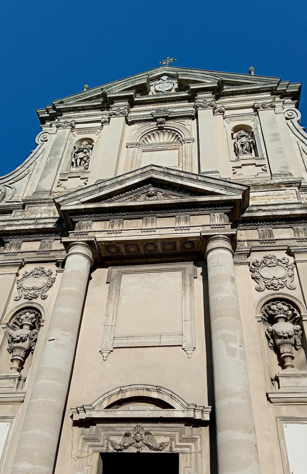 Красивый фасад здания разделен на два яруса такими архитектурными элементами, как карниз, фриз и архитрав. На нижнем ярусе можно увидеть декоративные вазы, а вот на втором уникальные скульптуры святых Иосифа и Терезы. Они были исполнены в 1688 году скульптором Андреасом Шванером. На тимпане (треугольнике под самой крышей) можно заметить гербы семей Собеских и Даниловичей, когда-то позолоченных.
