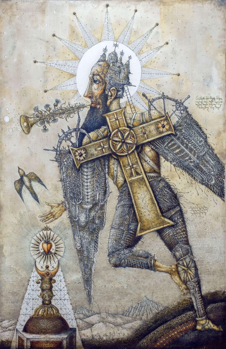 Название коллекции – ANTIQVITAS NOVA, что переводится как «новая старина». Картины олицетворяют украинский эпос о борьбе добра со злом. Персонажи картин – мифические создания, волшебники, герои из Библии, обобщенный образ воина, похожий своей эстетикой на героев классика мировой литературы, автора «Дон Кихота» Мигеля де Сервантеса. Практически любая работа подписана каллиграфией.