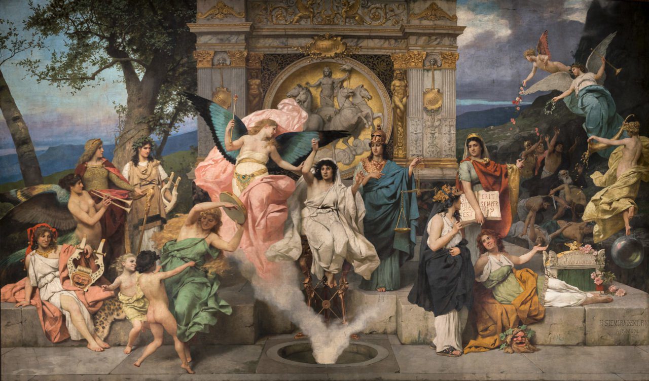 Основатели театра хотели, чтобы занавес под названием «Парнас» выглядел торжественно. Для этого они послали специалистов в Европу, чтобы они нашли образец изысканного занавеса. Посланникам понравились занавесы в театрах Милана и Кракова, которые создал художник Генрих Семирадский. Решили заказать для Львова занавес именно у него.