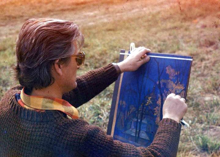 Интересна работа “Полдень” (1974 г.), где на переднем плане изображены орудия труда и его плоды в хозяйственном помещении, а через дверь виден двор, лошадь с повозкой, голубей образующие в небе треугольник. Треугольник – символ Троицы, символ связи человека с землей и небом, символ цикла человеческой жизни (рождение, жизнь, смерть). На картине можно увидеть также старый деревянный круг (символ круговорота жизни), весы – символ правосудия, красного петуха – защита от зла.