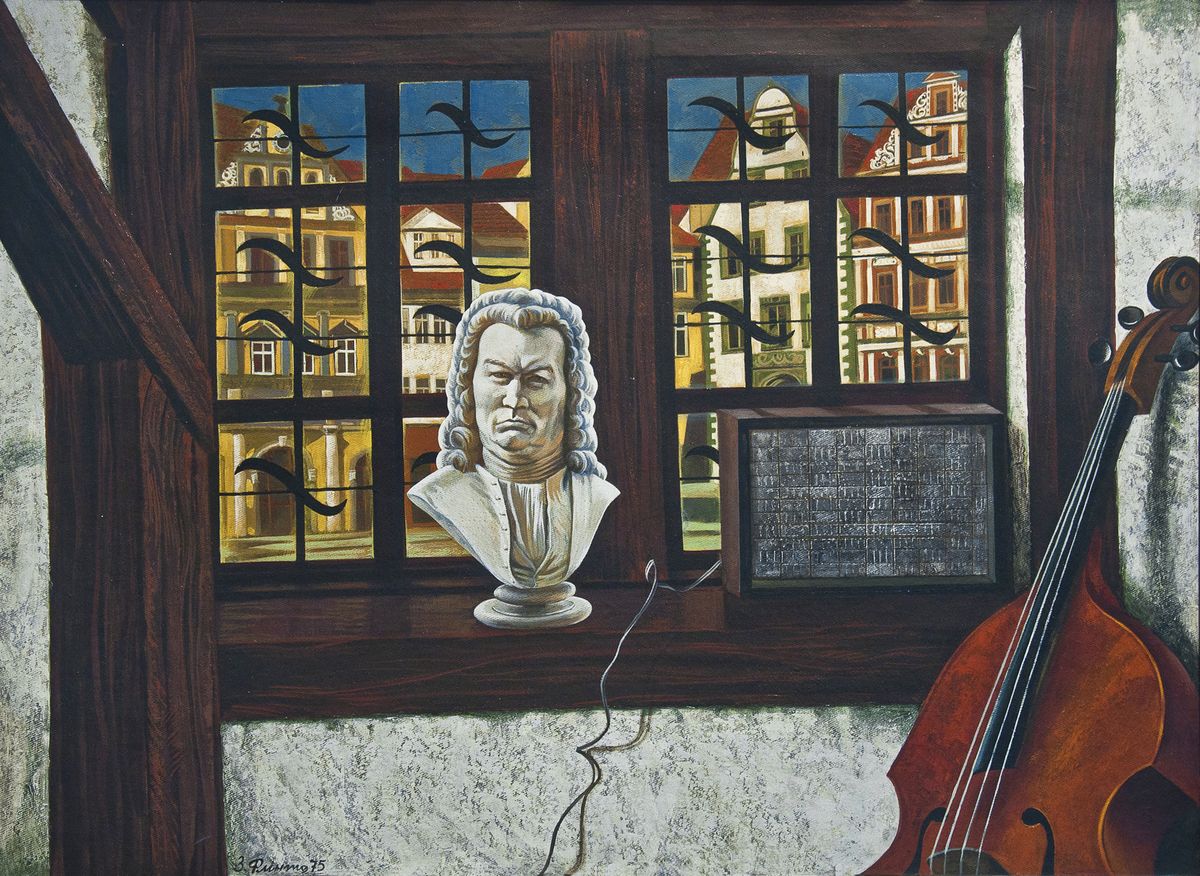 Например, на картинке “Автопортрет с горлицей” (1974 г.) можно увидеть следующие символы – кисти (жизнь в творчестве), горлицу (любовь) и город (Львов). В композиции “Мелодия Баха” (1975) можно увидеть виолончель и бюст Баха рядом с современной радиолой. Таким образом, художник желал соединить прошлое и настоящее, показать, что есть вещи, которые актуальны всегда, несмотря на течение времени.