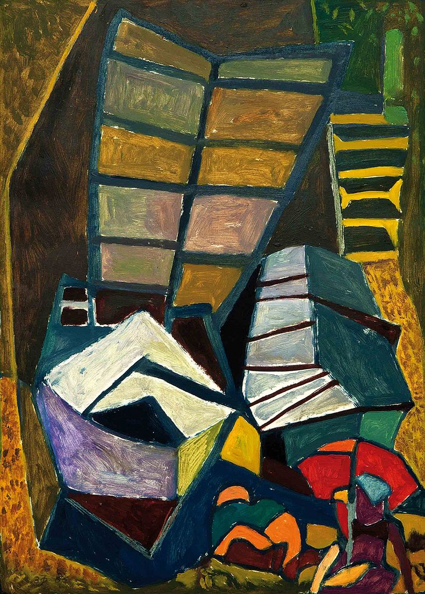 • с помощью ритмов плоскостей и цветных пятен усиливал идею произведения.