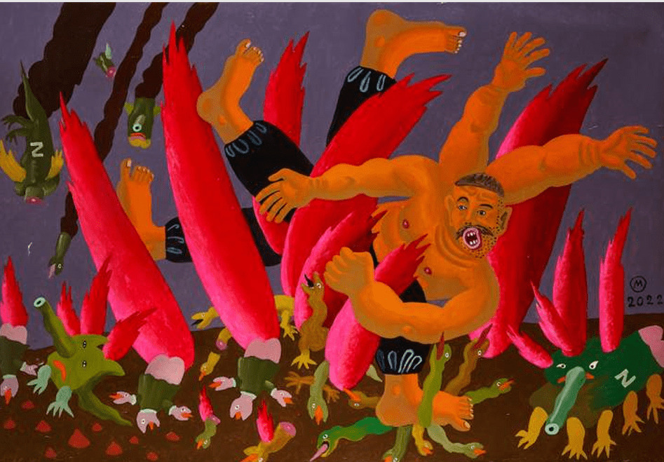 Картина «Гопак дядька Чорнобая» – одна із центральних робіт, що привертає до себе увагу відвідувачів виставки. На ній зображений вигаданий Дмитром персонаж – багаторукий Чорнобай. Він посеред полум’я танцює, розкидаючи ворожі танки-монстри.