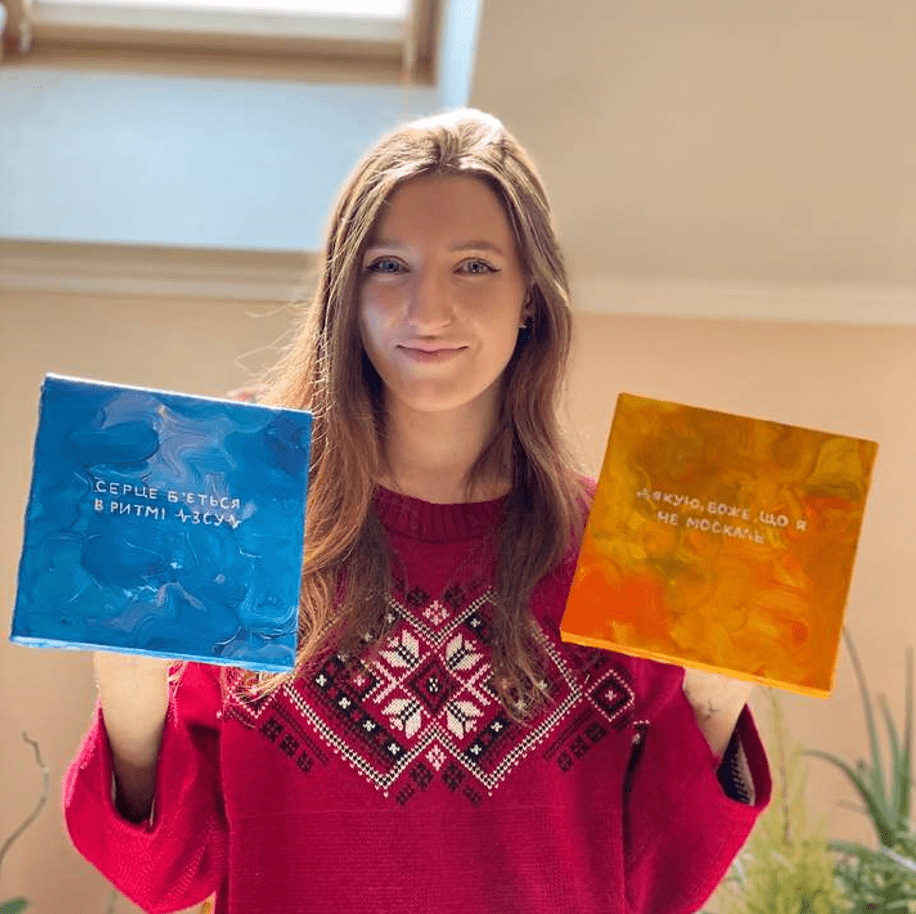 Першою роботою Оксани стала картина в синьо-білих тонах із фразою «Сміливість – це бути Україною». Надихнулася дівчина міжнародною рекламною кампанією Brave Ukraine, головна мета якої – поширити асоціацію «Україна = сміливість» як всередині країни, так і за кордоном.