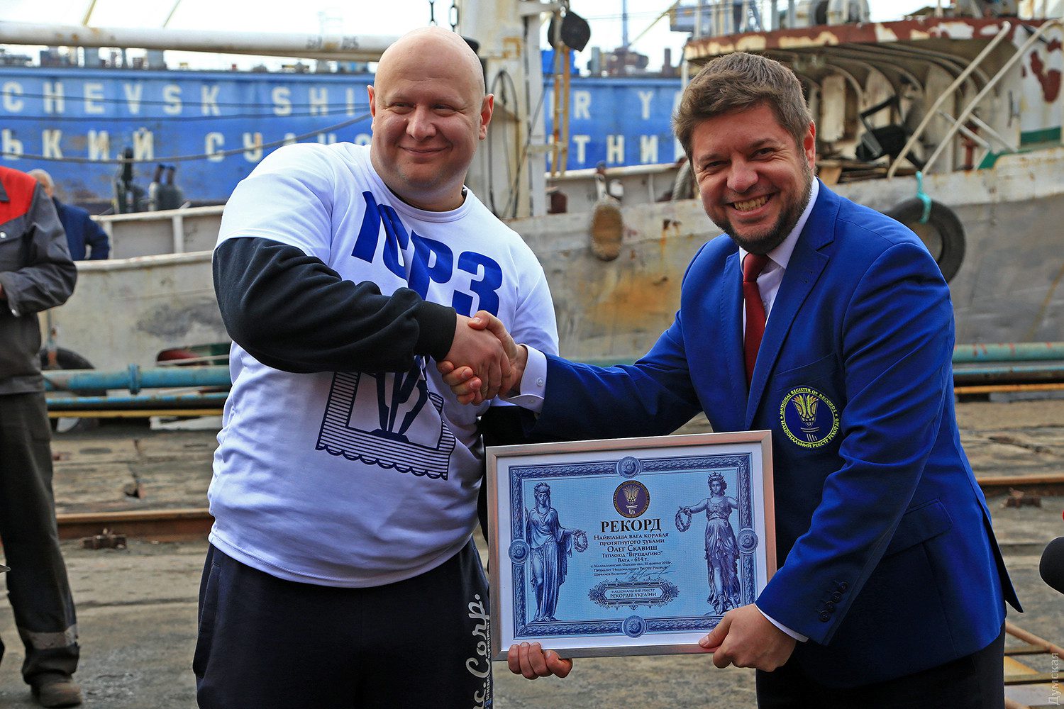 Вручення диплома Олегу Скавишу відбулось в Одесі.Тягнизуб став ювілейним п’ятдесятим українським рекордсменом-стронгменом, ім’я якого було урочисто записано у Книгу рекордів Гіннеса.