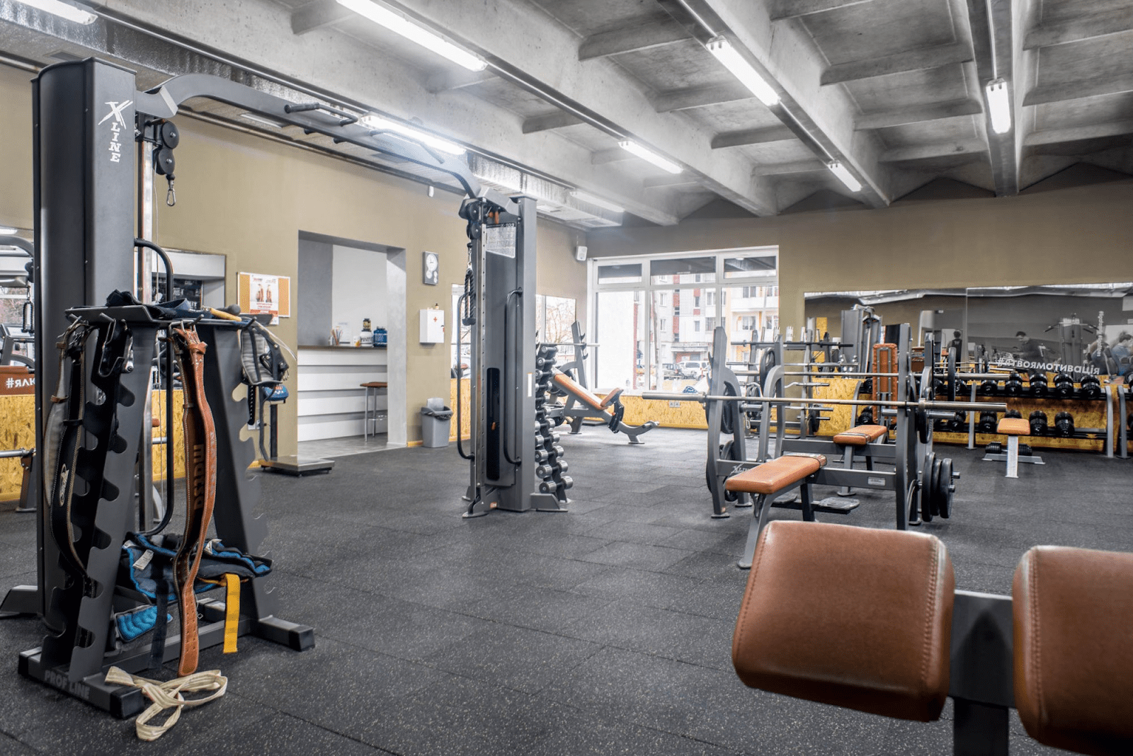 Перевагою тренажерного залу “Євроспорт” є високі стелі, природне світло, прихід свіжого повітря, просторість приміщення.  Додатково зал облаштований іонізаторами, що дезінфікують повітря та зменшують ризики захворюваності.