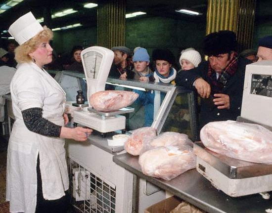 - М’ясо. Звісно, м’ясо продавали не лише у закладах державної торгівлі, а й на місцевих ринках. Проте купити їх у крамницях було практично нереально (а якщо і реально, то кісток там було більше, ніж самого м’яса), а на базарах ціни на м’ясо зашкалювали.